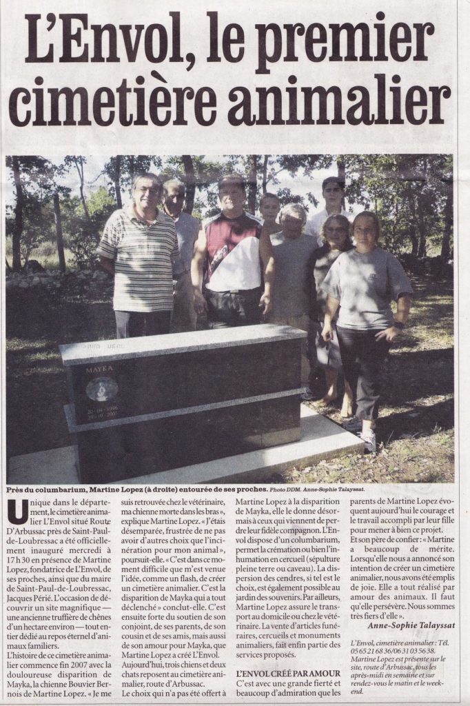 C’est ensuite forte du soutien de son conjoint, de ses parents, de son cousin et de ses amis, mais aussi de son amour pour Mayka, que Martine Lopez a créé L’Envol. Aujourd’hui, trois chiens et deux chats reposent au cimetière animalier, route d’Arbussac.